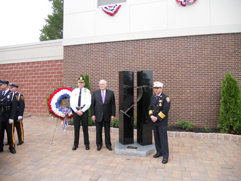 The Cherry Hill 9/11 memorial depicts the Twin Towers and has as its centerpiece a section of steel from the North Tower. Pictured here are Cherry Hill Police Chief Rick Del Campo, Mayor Bernie Platt, and Cherry Hill Fire Chief Robert Giorgio.
