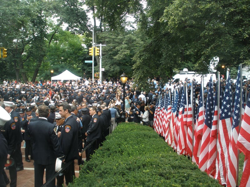 The 2011 FDNY Battalion 18 memorial service in New York City included 343 American flags, one flag for each FDNY firefighter who was lost.