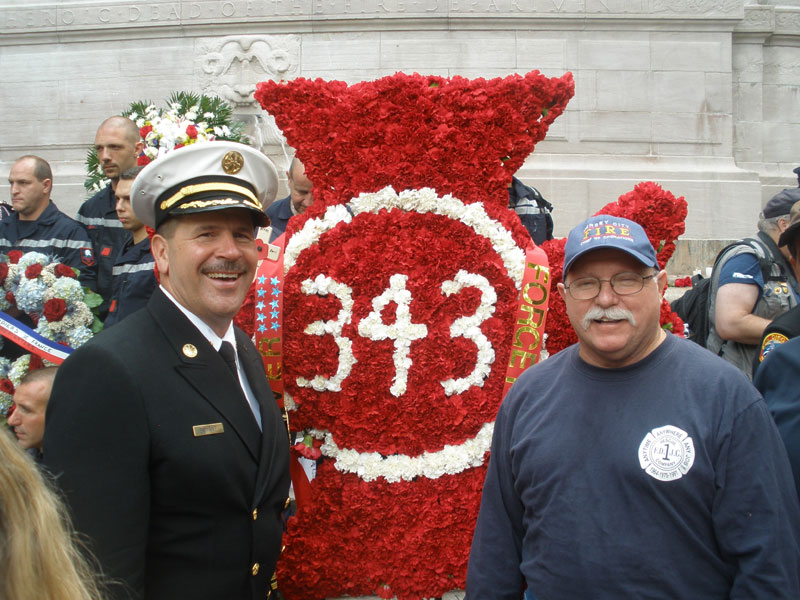 Butch Cobb (right) meets with Michael Bryant, assistant chief of the Los Angeles County Fire Department, in front of the memorial commemorating the 343 FDNY firefighters who lost their lives that day.