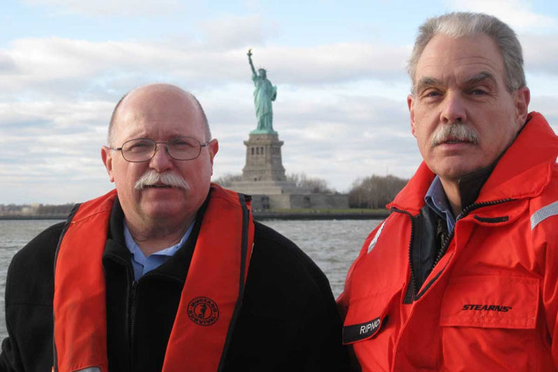 IAFC President Jack Parow (right) and ISO National Director of Community Hazard Mitigation Butch Cobb aboard the Jersey City fireboat Lovero, observing the New York/New Jersey harbor and discussing the potential problems associated with battling fires in high-rise buildings and dealing with terrorism threats in the area.