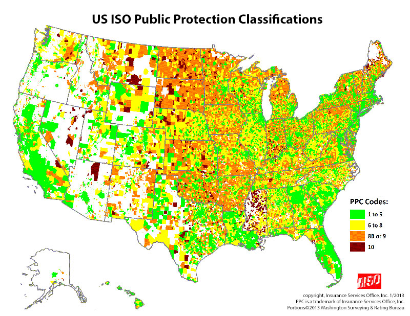 The map depicts area classifications in general. White denotes unprotected areas outside the legal jurisdiction of any fire district. The classification for any individual property may be different than indicated based on its distance from a recognized fire station and/or water supply. Lower PPC numbers indicate greater fire suppression capability. ISO statistics show that those communities have lower fire losses — and that’s good news for property insurers.